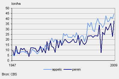 Opbrengst per hectare, appels en peren, 1947-2009*