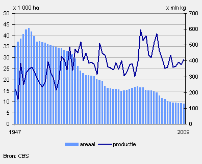 In 2009 is het appelareaal verder gedaald tot 9129 hectare. Dat is een daling van 2 procent ten opzichte van 2008. De opbrengst nam ondanks deze daling toch met 32 miljoen kilo toe. Er kwam in 2009 maar liefst 407 miljoen kilo appels van de bomen. Voor de appels is dat geen recordoogst. Dat blijft in handen van 1993, maar toen was het appelareaal 80 procent groter. In 1952 was het appelareaal het grootst, ruim 43 duizend hectare. Toch was de opbrengst in dat jaar met 347 miljoen kilo beduidend lager dan in 2009.