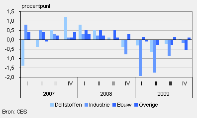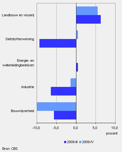 In het vierde kwartaal van 2009 lag de goederenproductie 2,2 procent lager dan in het overeenkomstige kwartaal van 2008. Deze daling was lager dan die in het derde kwartaal van 5,0 procent. De sterkste daling in 2009 had plaats in het tweede kwartaal; toen daalde de goederenproductie met 10,3 procent. Het lichte herstel in het vierde kwartaal is vooral te danken aan de industrie en de delfstoffenwinning. De krimp in deze bedrijfstakken was in het vierde kwartaal nog maar bescheiden.