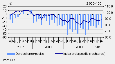 De ondernemers zijn nog steeds somber gestemd over hun werkvoorraad. Per saldo is 36 procent van mening dat de omvang van de orderportefeuille te klein is. De index van de orderpositie komt weliswaar iets hoger uit dan in de vorige maand maar ligt nog steeds op een laag niveau.