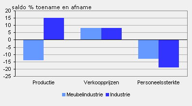 De productie is in de periode januari tot en met maart licht gedaald en voor de komende maanden wordt een verdere afname verwacht. Per saldo is één op de zeven ondernemers die mening toegedaan. Ook over de werkgelegenheid zijn de ondernemers in de meubelbranche somber gestemd. Er wordt een krimp voorzien.
