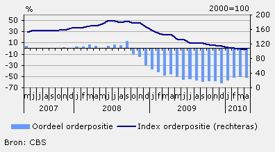 De ondernemers hebben in de periode februari tot en met april evenveel orders ontvangen als in de daaraan voorafgaande drie maanden. Doordat de productie toenam, daalde de orderpositie. Een ruime meerderheid van de ondernemers is van mening dat de werkvoorraad te klein is. De index van de orderpositie is uitgekomen op 104,5 (juli 2000=100) en bereikt daarmee het laagste niveau sinds oktober 2004.