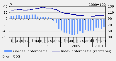 Per saldo heeft een kwart van de ondernemers meer orders ontvangen. Desondanks beoordelen zij hun werkvoorraad nog steeds als te klein. De stijging van de orderontvangst leidde niet tot een vollere orderportefeuille doordat de productie ook steeg. De index van de orderpositie daalde licht en kwam uit op 99,7 (juli 2000=100).