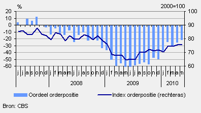 De orderontvangsten zijn in de afgelopen drie maanden toegenomen. De aan de orderportefeuille gerelateerde index orderpositie steeg hierdoor naar 75,8 (juli 2000=100). Niettemin zijn de ondernemers van mening dat hun orderportefeuille nog steeds ontoereikend is en dat hun voorraad gereed product te groot is.
