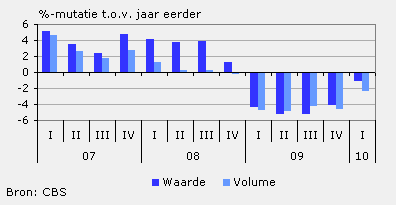 In het eerste kwartaal van dit jaar heeft de detailhandel 1,1 procent minder omzet behaald dan in het eerste kwartaal van 2009. De krimp was in vergelijking met voorgaande kwartalen beperkt en in maart werd zelfs meer omzet geboekt. Een paar branches lieten in het eerste kwartaal zelfs een groei van de omzet zien, zoals bijvoorbeeld de tankstations, drogisterijen en supermarkten.