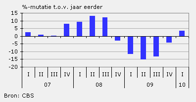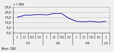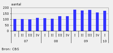 De stijging in het aantal faillissementen, die al sinds het derde kwartaal van 2008 zichtbaar was, eindigde in het eerste kwartaal van 2010. Het aantal faillissementen nam af met ruim 5 procent in vergelijking met het eerste kwartaal vorig jaar. Toch is er nog sprake van een groot aantal bedrijven dat over de kop ging, vergeleken met dezelfde periode in 2008. Toen bedroeg het aantal faillissementen iets meer dan 100 tegenover ruim 170 in het eerste kwartaal van dit jaar.