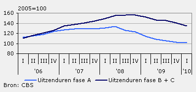 Het aantal uitzenduren (fase A) bij de uitzend- en uitleenbedrijven nam in het eerste kwartaal van 2010 met ruim 12 procent af ten opzichte van dezelfde periode een jaar eerder. Bij de uitzendbedrijven daalde het aantal uitzenduren nagenoeg even sterk. Ook het aantal detacheringsuren (fase B + C) bij de uitzend- en uitleenbedrijven nam in het eerste kwartaal met ruim 12 procent af. De daling was iets sterker dan een kwartaal eerder. Het totaal aantal uren (fase A + B + C) was in het eerste kwartaal ruim 12 procent lager dan in hetzelfde kwartaal van 2009. De daling is iets afgevlakt ten opzichte van het kwartaal ervoor.