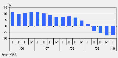 De omzet van de zakelijke dienstverleners vertoonde in het eerste kwartaal van 2010 nog geen tekenen van herstel. De omzet daalde met 7,4 procent in vergelijking met hetzelfde kwartaal in 2009. De omzetdaling was hiermee even groot dan een kwartaal eerder. De grootste klappen vielen bij de architecten, hun omzet daalde met 15,5 procent ten opzichte van een jaar eerder. Andere grote dalers waren managementadviesbureaus en uitzend- en uitleenbedrijven.