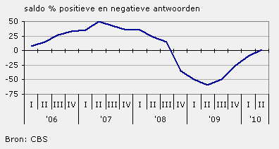 De bedrijven in de zakelijke dienstverlening hebben ook in het eerste kwartaal van 2010 een flinke omzetdaling behaald. De omzetkrimp lag op hetzelfde niveau als voorgaand kwartaal. De stemming onder de ondernemers over het economische klimaat is na bijna twee jaar weer licht positief. Zij verwachten voor het tweede kwartaal een omzetgroei te kunnen realiseren.