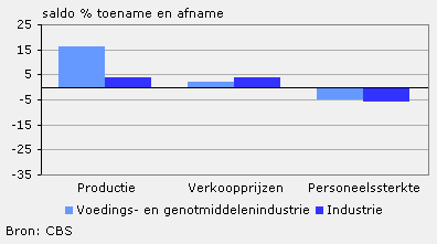 Naar verwachting zal het personeelsbestand in de voedings- en genotmiddelenindustrie licht afnemen. Voor de komende drie maanden voorzien de ondernemers een toename van de productie tegen iets hogere afzetprijzen.