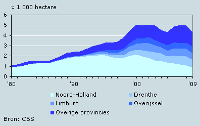 Oppervlakte lelies in enkele provincies, 1980-2009