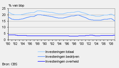 In 2009 was de investeringsquote veel lager dan een jaar eerder. Dat komt door de afgenomen bedrijfsinvesteringen. Het aandeel daarvan in het bbp was met ruim 15 procent zelfs lager dan in de voorgaande dertig jaar. Het aandeel van de overheidsinvesteringen schommelt al 30 jaar tussen de 3 en 4 procent.