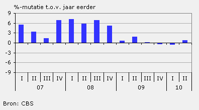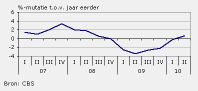 De consumptieve bestedingen door huishoudens waren in het tweede kwartaal 0,7 procent hoger dan een jaar eerder. In de vijf voorgaande kwartalen kromp de consumptie nog. Ondanks de lichte verbetering in het tweede kwartaal blijft de ontwikkeling van de consumptie zwak. De toename valt toe te schrijven aan twee factoren. Door het relatief koude weer werd meer aardgas verbruikt dan in het tweede kwartaal van 2009 en er werden meer personenauto’s aangeschaft dan een jaar eerder. De consumptiecijfers zijn gecorrigeerd voor prijsveranderingen.