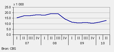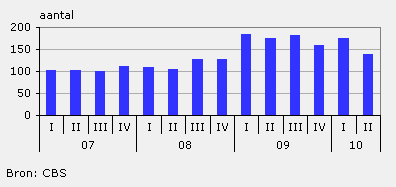 Het aantal faillissementen is in het tweede kwartaal afgenomen ten opzichte van dezelfde periode in 2009. Legden in 2009 nog 176 bedrijven het loodje in het tweede kwartaal, in 2010 waren dat er 139. Dit is duidelijk lager dan het aantal faillissementen in de voorgaande vijf kwartalen, maar hoger dan de niveaus in 2008.