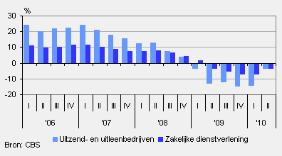 De uitzend- en uitleenbedrijven realiseerden in het tweede kwartaal van 2010 een omzetdaling van ruim 3,5 procent in vergelijking met dezelfde periode een jaar eerder. De omzetkrimp was een stuk kleiner dan in het voorgaande kwartaal. De omzetdaling bij de uitzend- en uitleenbedrijven was nagenoeg even groot als die van de totale zakelijke dienstverlening.