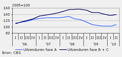 Na bijna twee jaar van krimp nam de vraag naar uitzendkrachten (fase A) bij uitzend- en uitleenbedrijven in het tweede kwartaal van 2010 voor het eerst weer licht toe. Het aantal uitzenduren steeg met een 0,5 procent ten opzichte van dezelfde periode een jaar eerder. Het aantal detacheringsuren (fase B + C) bij de uitzend- en uitleenbedrijven bleef nog 3,5 procent achter. Bij de uitzendbedrijven steeg het aantal detacheringsuren met ruim 1 procent. Het totaal aantal uren (fase A + B + C) bij de uitzend- en uitleenbedrijven was in het tweede kwartaal ruim 1 procent lager dan in hetzelfde kwartaal van 2009.