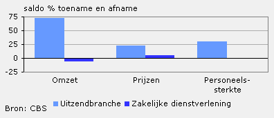 De ondernemers verwachten voor het derde kwartaal van 2010 een toename van zowel de omzet, de prijzen als de personeelssterkte. Drie van de vier ondernemers verwacht per saldo een toename van de omzet te behalen en nagenoeg een op de vier van hen denkt hogere prijzen te kunnen doorberekenen aan hun klanten. Verder verwacht per saldo een op de drie dat de werkgelegenheid in de branche zal toenemen. De ondernemers in de uitzendbranche zijn positiever in hun verwachtingen over het derde kwartaal dan de totale zakelijke dienstverlening.