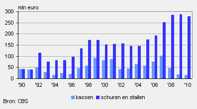 De geplande bouwsom voor de nieuwbouw van kassen bedroeg 16 miljoen euro. over het eerste halfjaar van 2010. Deze cijfers zijn vooral te wijten aan het slechte eerste kwartaal. In dat kwartaal werd er voor slechts 1 miljoen euro aan bouwvergunningen voor kassen aangevraagd. De geplande bouwsom voor nieuwe schuren en stallen bedroeg over het eerste halfjaar 277 miljoen euro. De bouwsom per vierkante meter lag daarmee ongeveer 5 euro lager dan een jaar eerder.