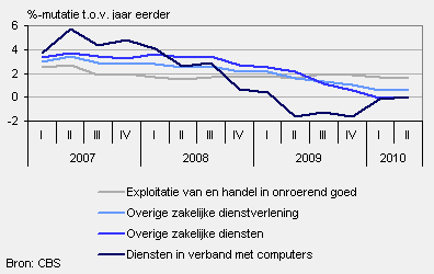 In het tweede kwartaal van 2010 waren de prijzen van de commerciële dienstverlening 1,6 procent hoger dan een jaar eerder. Vorig kwartaal was er een lichte stijging van 0,6 procent.