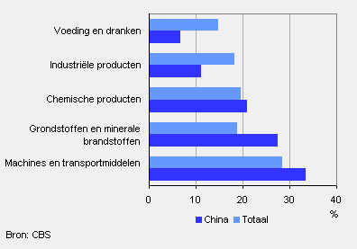 De producten die Nederland rechtstreeks naar China uitvoert, vallen voor het grootste deel (61 procent) onder de goederencategorieën grondstoffen en minerale brandstoffen en machines en transportmiddelen. In de totale Nederlandse uitvoer zijn deze categorieën veel minder vertegenwoordigd (47 procent). De meest uitgevoerde producten naar China zijn machine-onderdelen, metalen, metaalresten en chemische grondstoffen.