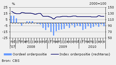 De orderontvangst is volgens de ondernemers in de afgelopen drie maanden evenals de productie licht toegenomen. Als gevolg daarvan bleef de werkvoorraad nagenoeg onveranderd. De index orderpositie kwam uit op 120,2 (juli 2000=100). De ondernemers beoordelen de omvang van de orderportefeuille als te klein. Zes procent van hen is per saldo die mening toegedaan.
