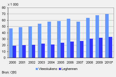 Bij de bedrijven met vleeskuikens waren in 2010 gemiddeld 70 duizend vleeskuikens aanwezig. Vergeleken met 2000 is dit een stijging van 50 procent. In dezelfde periode is het gemiddeld aantal leghennen bij de bedrijven met leghennen met 73 procent gestegen tot 33 duizend hennen.