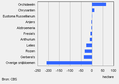 De totale oppervlakte snijbloemen daalde in het afgelopen met 244 hectare. De provincies Zuid-Holland, Noord-Holland en Gelderland hadden de grootste afnames met respectievelijk 80, 80 en 28 hectare. Enkele bloemsoorten lieten daarentegen een groei zien: de arealen orchideeën en chrysanten zijn respectievelijk 66 en 11 hectare toegenomen ten opzichte van 2009. De grootste bijdrage in deze groei leverde de provincie Zuid-Holland met 51 hectare bij de orchideeën en 17 hectare bij de chrysanten.