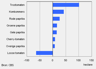 De arealen van de meeste glasgroenten in Nederland zijn toegenomen. Het areaal trostomaten had met 102 hectare de grootste groei. Daar staan de losse tomaten tegenover met een afname van 64 hectare. De tomatenteelt had in totaal een groei van 48 hectare, waaraan Zeeland met 27 hectare en Zuid-Holland met 15 hectare het meeste bijdroegen. Afnames waren er alleen in Friesland met 5 hectare en in Noord-Holland met 1 hectare. Het totale areaal paprika’s groeide met 68 hectare en het areaal komkommers met 42 hectare.