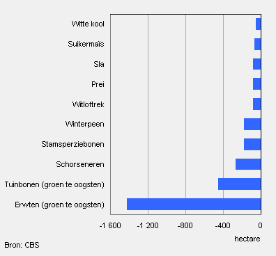 In 2010 is op 76 duizend hectare groenten geteeld in de open grond. Ten opzichte van 2009 is dat een afname met 300 hectare. Het uienareaal kende met een toename van 2,9 duizend hectare de grootste groei. Het areaal erwten had met een afname van 1,4 duizend hectare de grootste krimp. Dit blijkt uit de voorlopige cijfers van de Landbouwtelling 2010.