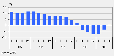 In de zakelijke dienstverlening nam de omzet licht toe in het derde kwartaal van 2010. De zakelijke dienstverleners behaalden 0,4 procent meer omzet dan in dezelfde periode een jaar eerder. De omzetgroei volgt op vijf kwartalen van omzetverlies. De hoogste groeicijfers werden gemeten in de keuring en controle, reclamebureaus, markt- en opinieonderzoeksbureaus en reisbranche. De omzet van bedrijven in de reisbranche groeide het sterkst. Hun omzet nam met bijna 12 procent toe in vergelijking met het derde kwartaal van 2009. Architecten zagen hun omzet dalen met ruim 12 procent in vergelijking met een jaar eerder. Daarmee waren de architecten ook in het derde kwartaal de minst presterende binnen de zakelijke dienstverlening.