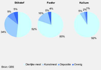 De totale aanvoer van stikstof en fosfor op landbouwgrond bedraagt circa 90 procent respectievelijk 85 procent van de totale aanvoer op Nederlandse bodems.