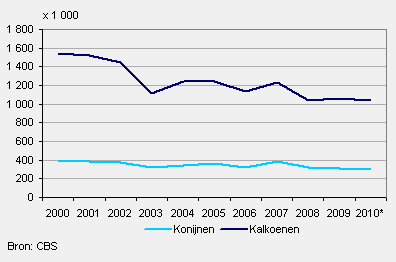 In de periode 2000-2010 is het aantal kalkoenen op landbouwbedrijven met bijna eenderde gedaald tot 1 miljoen stuks. In diezelfde periode nam het aantal konijnen af met bijna een kwart tot 300 duizend. In 2010 waren er 91 bedrijven met konijnen en 56 bedrijven met kalkoenen.