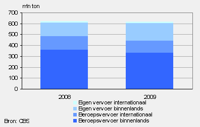 In 2009 werd er door Nederlandse wegtransporteurs 617 miljoen ton aan goederen vervoerd. Dat was iets minder dan in 2008. De krimp kwam door de daling van het internationale wegtransport. Het binnenlandse wegtransport nam juist toe.