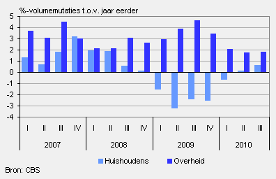 Het volume van de totale overheidsconsumptie is in het derde kwartaal van 2010 met 1,8 procent gestegen ten opzichte van het overeenkomstige kwartaal een jaar eerder. De groei van de overheidsconsumptie in natura bedroeg ruim 3 procent. Deze werd vooral veroorzaakt door uitgaven aan zorg die door de overheid gefinancierd worden. De consumptie van het rijk kromp licht, maar daartegenover staat dat vooral de consumptie van sociale verzekeringsinstellingen, overig openbaar bestuur, defensie en gemeenten een groei lieten zien. Hierdoor is de collectieve overheidsconsumptie met 0,6 procent toegenomen. De groei van de individualiseerbare overheidsconsumptie was 1,4 procent. Deze groei was vooral het gevolg van toenemende leerlingaantallen in het hoger onderwijs.