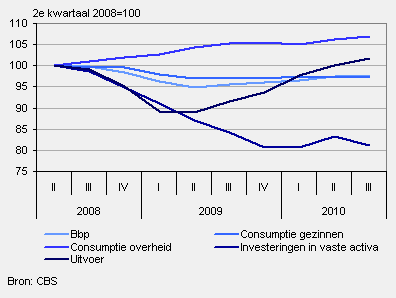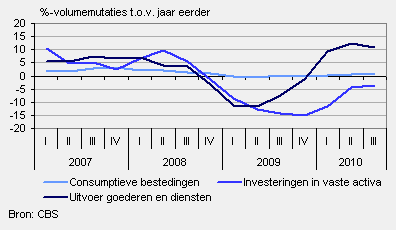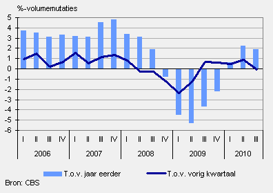 De Nederlandse economie is in het derde kwartaal van 2010 gegroeid met 1,9 procent. De groei pakte iets lager uit dan in het tweede kwartaal. Ten opzichte van een kwartaal eerder bleef het bpp gelijk. Deze pas op de plaats volgt op vier kwartalen van behoorlijke groei. Dat de omvang van de economie ten opzichte van het voorafgaande kwartaal niet verder toenam, komt vooral doordat de voorraden nauwelijks verder zijn aangevuld en doordat er minder gas is uitgevoerd.