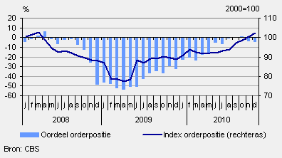 De omvang van de orderportefeuille is volgens de ondernemers verder gegroeid. De werkvoorraad die tot uitdrukking komt in de index van de orderpositie, is in december uitgekomen op 102,3 en bereikt daarmee het hoogste niveau sinds september 2007. Van de ondernemers is 85 procent van mening dat de werkvoorraad, gelet op de tijd van het jaar, als normaal kan worden beschouwd. Volgens 5 procent van hen is de orderportefeuille te groot en 10 procent van de ondernemers meent onvoldoende werk in voorraad te hebben.
