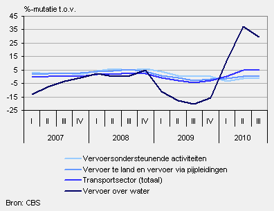 De prijzen van diensten in de transportsector waren in het derde kwartaal van 2010 4,7 procent hoger dan een jaar eerder. Dit is de grootste stijging sinds 2006. Vorig kwartaal was er ook een forse stijging, namelijk 4,6 procent. Een jaar geleden, in het derde kwartaal van 2009, lagen de prijzen nog ruim 4 procent lager dan het jaar ervoor.