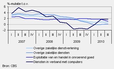In het derde kwartaal van 2010 waren de prijzen van de commerciële dienstverlening 1,6 procent hoger dan een jaar eerder. Deze prijsstijging komt ongeveer overeen met de stijging van het tweede kwartaal. Toen lagen de prijzen 1,7 procent hoger dan een jaar eerder.