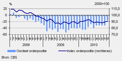 De orderontvangst is in de periode september tot en met november toegenomen. Volgens de ondernemers is er in diezelfde periode ook meer geproduceerd. Per saldo groeide de werkvoorraad. De index van de orderpositie is in december uitgekomen op 91,1 (juli 2000=100) en is daarmee groter dan in de voorafgaande zes maanden het geval was. Het oordeel over de orderpositie is weliswaar nog steeds negatief, maar beduidend minder dan in de afgelopen twee jaar.