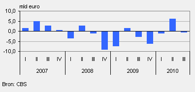Het saldo van de primaire inkomens kwam in het derde kwartaal van 2010 uit op -0,8 miljard euro: Nederland betaalde dus bijna een miljard euro meer aan het buitenland dan het aan primaire inkomens ontving. In het derde kwartaal van 2009 kwam het saldo uit op -3,0 miljard. Dit was een flinke verslechtering in vergelijking met het derde kwartaal van 2007, dus vóór de kredietcrisis, toen Nederland nog een positief saldo van 2,7 miljard kende.