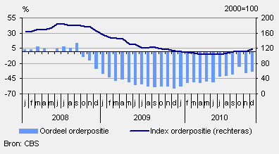 De orderontvangst is in de periode van september tot en met november fors toegenomen. Ook hebben de ondernemers in diezelfde periode een sterke toename van de productie gerealiseerd. Doordat de toename van de orderontvangst groter was dan de productiestijging, groeide de werkvoorraad. De index orderpositie steeg met ruim 7 punten tot 118,5 (juli 2000=100); het hoogste niveau in ruim een jaar. Ondanks de grotere werkvoorraad vindt per saldo een op de drie ondernemers dat hun orderpositie nog te klein is.