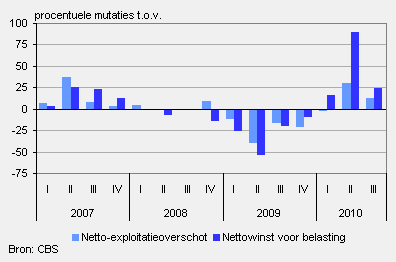 In het derde kwartaal van 2010 steeg de winst van niet-financiële ondernemingen met bijna 25 procent ten opzichte van het overeenkomstige kwartaal van 2009. Het herstel dat zich in het eerste kwartaal van 2010 aftekende zet daarmee door. De nettowinst voor belastingen nam met 6,0 miljard toe tot 30,8 miljard euro en komt hiermee bijna op het niveau van voor de economische crisis.