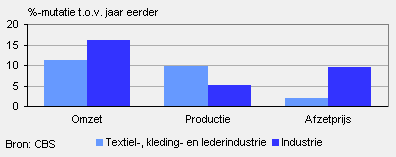De textiel-, kleding- en lederindustrie heeft in november vorig jaar 11 procent meer omgezet dan in november 2009. De omzettoename werd volledig gedragen door een gunstige ontwikkeling op de exportmarkt. Daar werd een vijfde meer omgezet. In het binnenland zag het beeld er compleet anders uit: het bedrag aan verkopen was hier bijna 2,5 procent lager dan een jaar eerder. In november beïnvloedden een gunstig kalendereffect van een werkdag meer en een hogere afzetprijs de omzet positief. Per gemiddelde werkdag was het verkoopvolume ruim 4 procent groter.