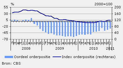 In de periode van oktober tot en met december 2010 zijn er meer orders ontvangen. De ondernemers hebben in diezelfde periode ook meer geproduceerd. De index orderpositie kwam met 117,9 (juli 2000=100) iets lager uit dan in december 2010. Per saldo vindt 29 procent van de ondernemers dat hun orderpositie te klein is.