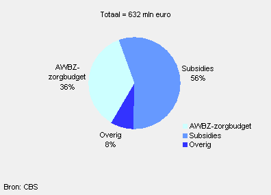 Een tweede belangrijke financieringsbron is het AWBZ-zorgbudget. Het aandeel hiervan in de omzet is 36 procent. De meeste MO/VO-instellingen ontvangen hun zorgbudget op basis van een toelating geestelijke gezondheidszorg, bijvoorbeeld voor beschermd wonen en begeleiding. Overige bedrijfsopbrengsten bestaan onder andere uit eigen bijdragen van cliënten en overige dienstverlening.