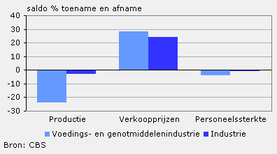 Voor de periode januari tot en met maart verwacht een kwart van de ondernemers in de voedings- en genotmiddelenindustrie een productieafname ten opzichte van de voorgaande drie maanden. Per saldo verwacht 28 procent van hen dat de afzetprijzen in de komende drie maanden gaan stijgen. Verder voorziet een kleine meerderheid voor de komende periode een kleiner personeelsbestand.