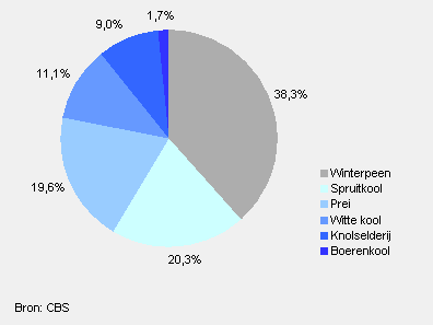Winterpeen, spruitjes en prei waren in 2010 goed voor ruim driekwart van de oppervlakte wintergroente. Winterpeen heeft qua oppervlakte een aandeel van 38 procent van het wintergroenteareaal en de spruiten en prei hebben elk een aandeel van ongeveer 20 procent.