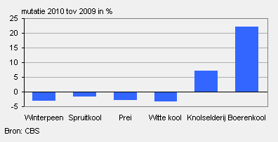 Het wintergroentenareaal nam in 2010 ruim 225 hectare minder dan een jaar eerder in beslag. Dit is een afname van 1,5 procent. Van de wintergroenten zijn alleen de arealen van boerenkool (+22 procent) en knolselderij (+7 procent) in 2010 toegenomen. De daling in het areaal van spruiten was het laagst (-1,6 procent) die van witte kool het grootst (-3,3 procent). Van de winterpeen en prei werd grofweg 3 procent minder verbouwd.