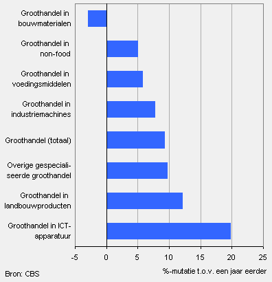 Vrijwel in alle branches binnen de groothandel was de omzet hoger. De grootste stijging kwam voor rekening van de groothandel in ICT-apparatuur. De groothandel in bouwmaterialen kampte weliswaar opnieuw met omzetverlies, maar minder sterk dan in voorgaande kwartalen.