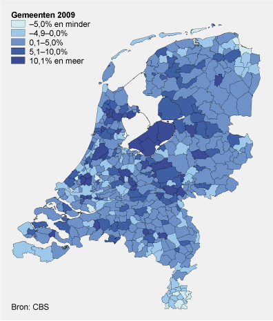 De Nederlandse bevolking is tussen 1999 en 2009 toegenomen met 4,6 procent. Volgens de bevolkingsprognoses van het CBS zal het aantal inwoners rond 2040 landelijk gaan dalen. Aan de randen van Nederland is de bevolking echter al jaren aan het krimpen. Dat is vooral het geval in gemeenten in Zuid-Limburg en Delfzijl en omgeving (zie kaart 4). De krimp was het grootst in de gemeente Vaals met ruim 10 procent. Lichtere krimp komt verspreid over het land voor, ook in de Randstad. Alleen Drenthe en Flevoland hebben geen enkele krimpende gemeente.